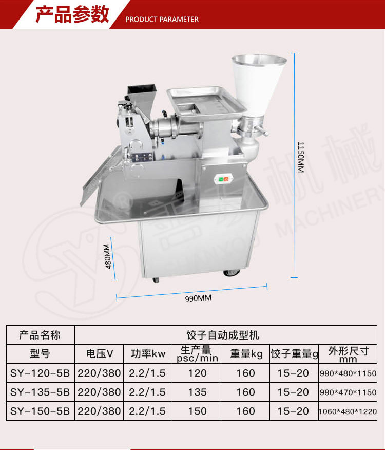 SY-JZJ系列饺子自动成型机,本机适用于宾馆、饭店、餐厅、团体食堂加工、幼儿园、速冻饺子生产。各种肉馅、肉菜混合馅、全菜馅及其它种馅的饺子。